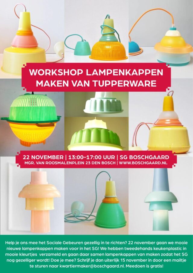 Zaterdagmiddag 22 november gaan we samen aan de slag om van oude plastic keukenspullen nieuwe lampjes te maken. Leuk om te doen, leuk om te leren, en samen maken we de SG leuker.